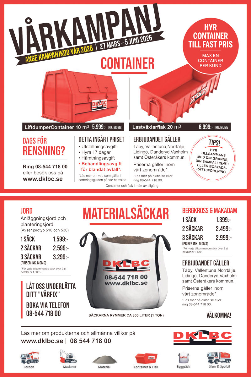 Ge din trädgård eller ditt företag en nystart i vår! Mellan den 27 mars och 5 juni 2026 firar vi våren med riktigt fina priser på containrar och materialsäckar.